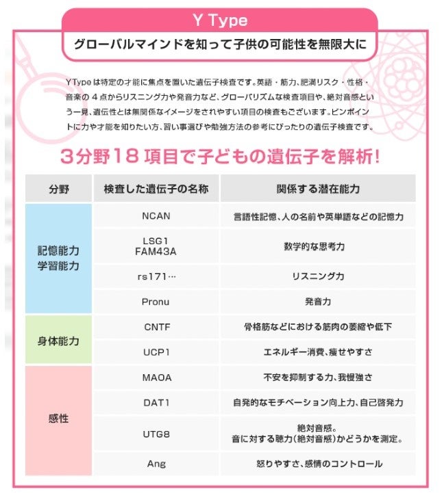 タイプYでは、検査されていない10の遺伝子を新たに検査します。音への能力方向性を考えさせる絶対音感や朗読発音力など尖った能力に関係する遺伝子を中心に検査することができます。進むべき教育視野が広がり、今までの普遍的な価値観を覆すコラムも満載です。