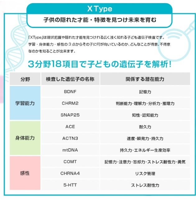 株式会社アルプロンのグループ会社、DTCフィールドで子ども向けの能力遺伝子検査数最大シェア数を誇る株式会社DNA FACTOR(福岡県福岡市:代表取締役 多根和宏)は、主力商品である「子どもの能力遺伝子検査キット/タイプX」「子どもの能力遺伝子検査キット/タイプY」の、分野別商品をリリースいたしました。